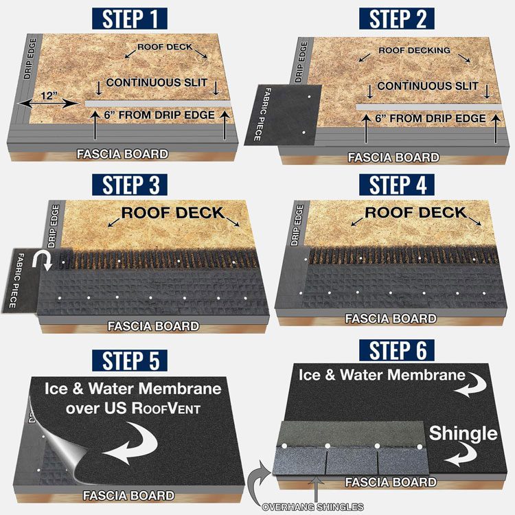 NOTE:US RoofVent can be installed under virtually any shingle course using proper installation techniques.US RoofVent should be installed on shingled roofs with a minimum of 4/12 pitch. There is no maximum slope limitation. Low slope roofs with less than 4/12 pitch can use FasciaVent by DCI for intake ventilation. Use of continuous ridge vents or other exhaust vents are required. No Moisture from household appliances, equipment or fixtures can be discharged into the attic area